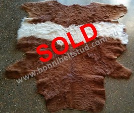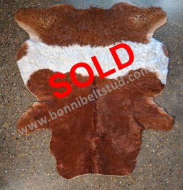 #82 This Red and White Belted Galloway hide has standing neck hair and tight curls of lighter red in circles on his rear legs. The belt hair is slightly wavy whilst the underbelly hair is longer with some tighter curls.Length 188 cmsGirth 159 cmsFront Legs 145 cmsRear Legs 169 cmsSold to the WA